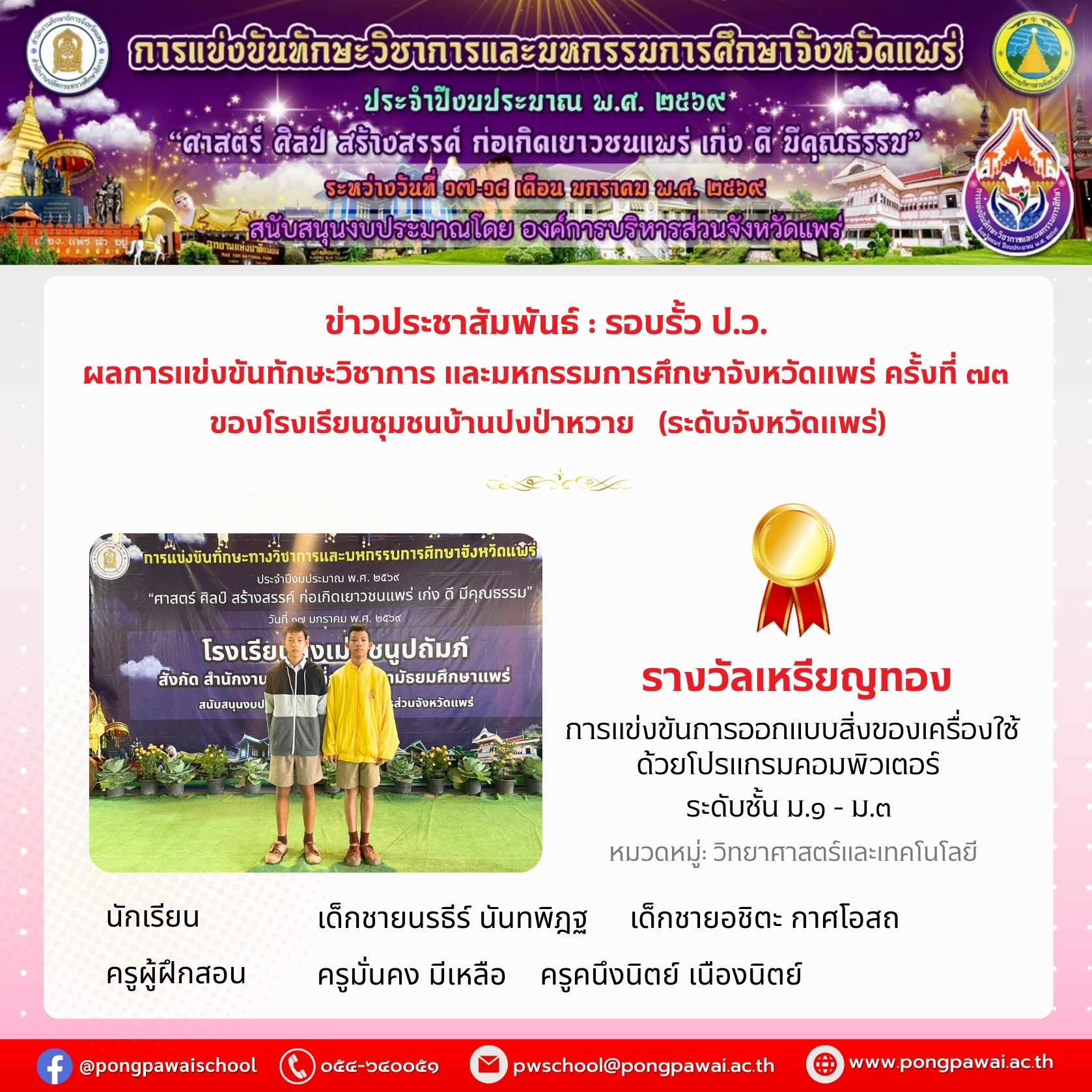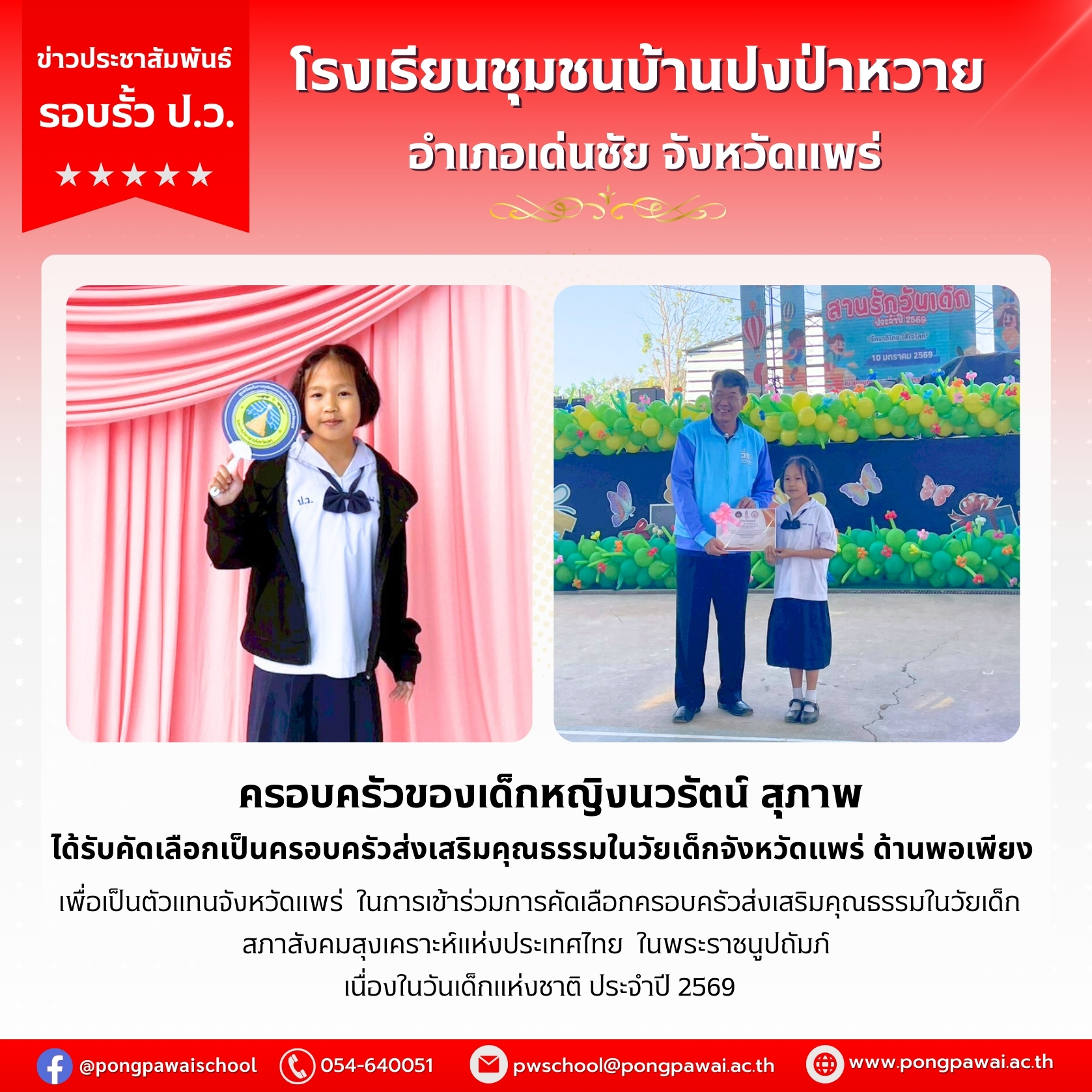 วันที่ 10 มกราคม 2569 ครอบครัวของเด็กหญิงนวรัตน์ สุภาพ ได้รับคัดเลือกเป็นครอบครัวส่งเสริมคุณธรรมในวัยเด็กจังหวัดแพร่ ด้านพอเพียง เพื่อเป็นตัวแทนจังหวัดแพร่ ในการเข้าร่วมการคัดเลือกครอบครัวส่งเสริมคุณธรรมในวัยเด็ก สภาสังคมสุงเคราะห์แห่งประเทศไทย ในพระราชนูปถัมภ์ เนื่องในวันเด็กแห่งชาติ ประจำปี 2569