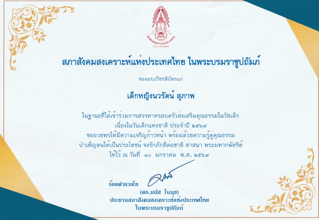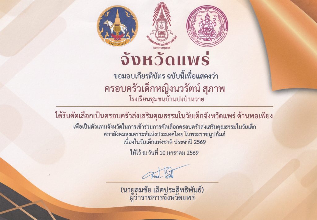 วันที่ 10 มกราคม 2569 ครอบครัวของเด็กหญิงนวรัตน์ สุภาพ ได้รับคัดเลือกเป็นครอบครัวส่งเสริมคุณธรรมในวัยเด็กจังหวัดแพร่ ด้านพอเพียง เพื่อเป็นตัวแทนจังหวัดแพร่ ในการเข้าร่วมการคัดเลือกครอบครัวส่งเสริมคุณธรรมในวัยเด็ก สภาสังคมสุงเคราะห์แห่งประเทศไทย ในพระราชนูปถัมภ์ เนื่องในวันเด็กแห่งชาติ ประจำปี 2569