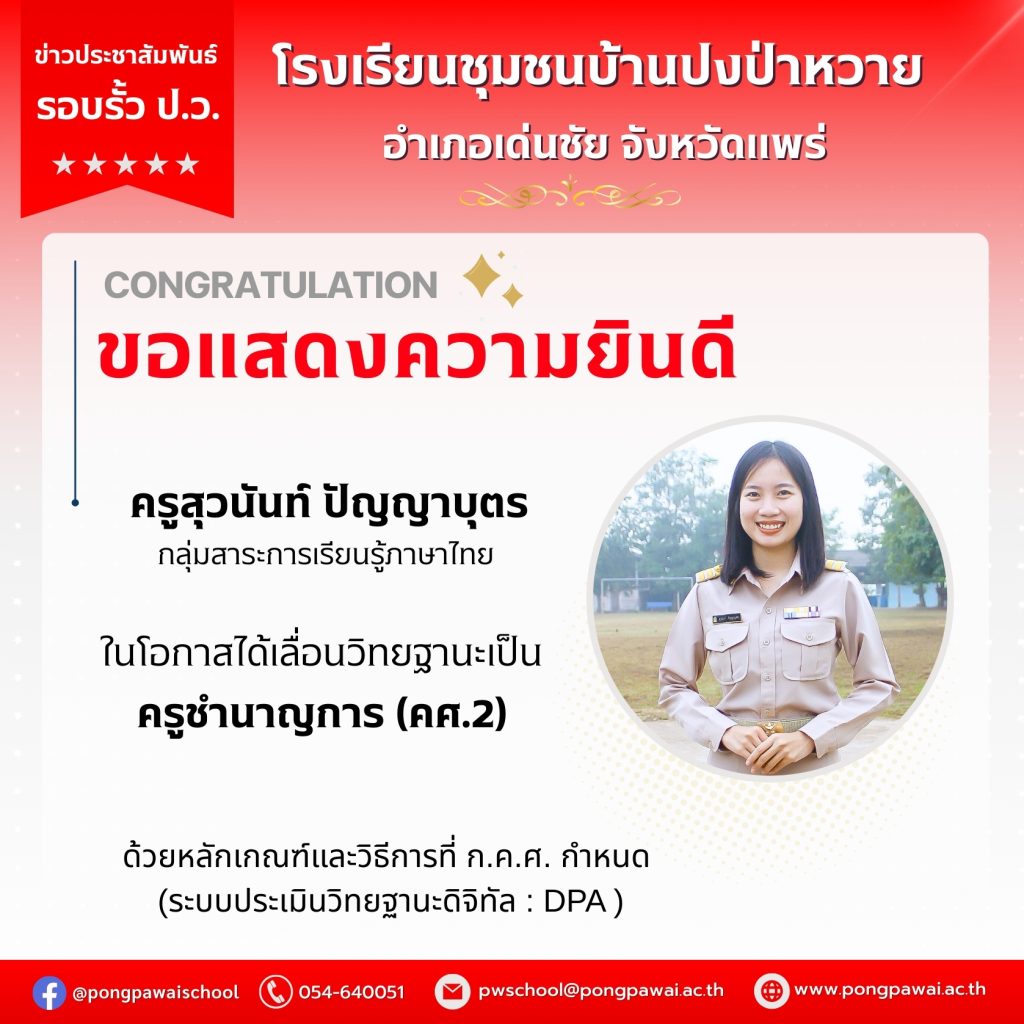 ขอแสดงความยินดี ครูสุวนันท์ ปัญญาบุตร ในโอกาสได้เลื่อนวิทยฐานะเป็น ครูชำนาญการ (คศ.2)